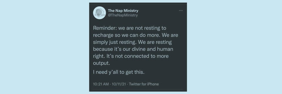 En lugar de, “Recarga ahora, y haz más después”, The Nap Minstry (El Ministerio de la Siesta) nos anima sabiamente a descansar simplemente porque es nuestro derecho.