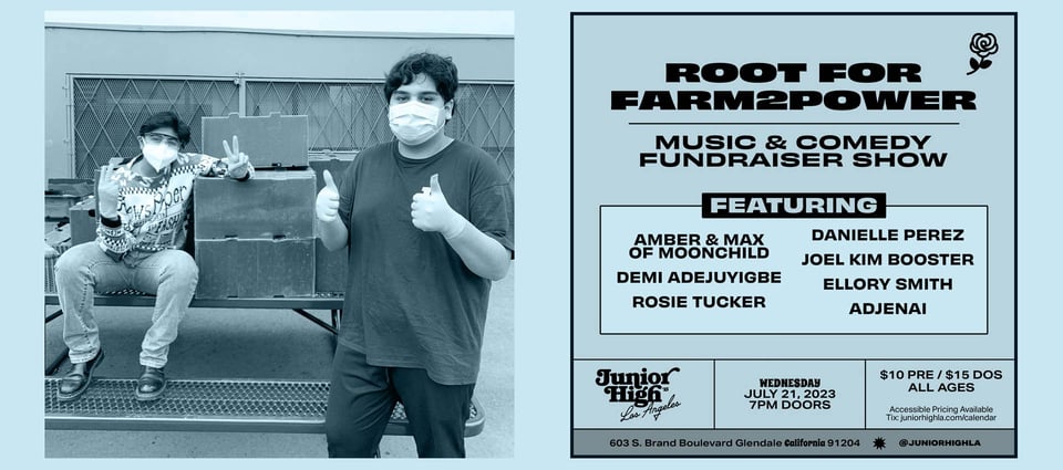 - ASISTIR al Root for Farm2Power, show de música y comedia el 21 de julio en Junior High Los Angeles, 603 S. Brand Blvd, Glendale CA 91204. Consigue entradas.